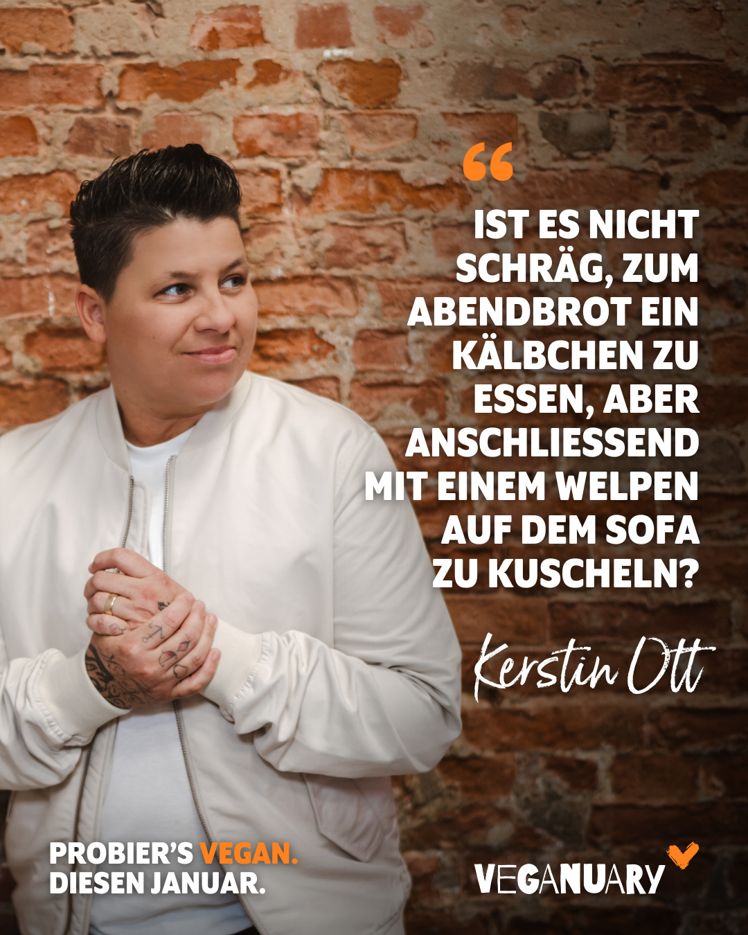 Als neue Veganuary-Unterstützerin ist Schlager-Star Kerstin Ott dabei. Sie ernährt sich bereits seit rund zwei Jahren vegan und fragt: „Ist es nicht schräg, zum Abendbrot ein Kälbchen zu essen, aber anschließend mit einem Welpen auf dem Sofa zu kuscheln?“ Auch für Maria Clara Groppler sind Tierliebe und Fleischessen nicht vereinbar. Marie von den Benken sieht es als klaren Widerspruch in unserer eigentlich aufgeklärten Gesellschaft. Und Schauspieler Jonathan Elias Weiske hinterfragt Klischees über Männlichkeit: „Schräg, dass wir mal gedacht haben, es sei besonders männlich, Fleisch zu essen. Für mich ist es viel männlicher, bewusst, empathisch, rücksichtsvoll, nachhaltig und liebend zu sein!“