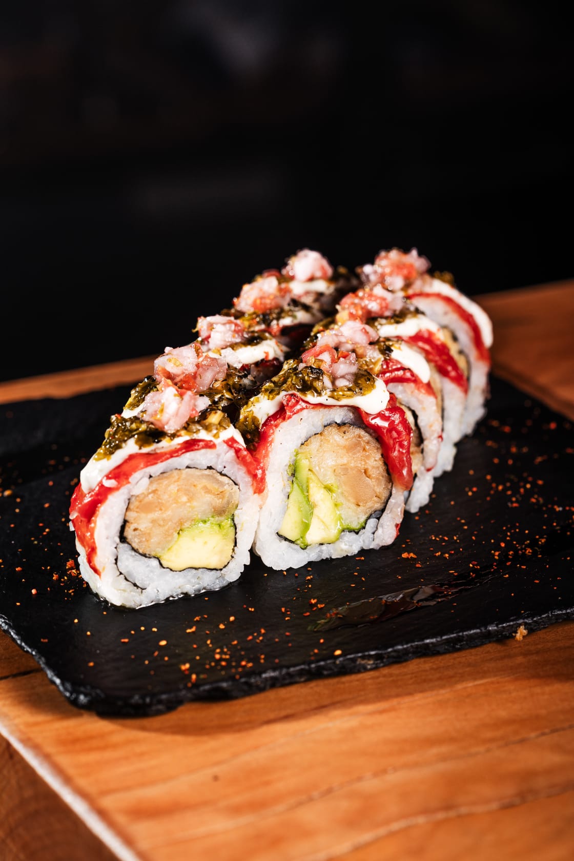 Yasai Vegan Sushi: En este restaurante de cocina vegana nikkei es posible encontrar diferentes sabores y texturas que imitan los sabores del mar, pero solo a base de ingredientes vegetales. Una de sus preparaciones destacadas es el roll cubierto de Notuna y sandía horneada con fondo de algas. Su chef y creador, Carlos Zúñiga, comenta que “lo principal de los productos marinos que manejamos tales como Notuna, Noikura o NoPejerrey es el delicioso sabor que se puede lograr con los distintos tipos de algas que tenemos a nuestra disposición. Combinados con un rico seitán de verdad que sabor y textura son inigualables”.