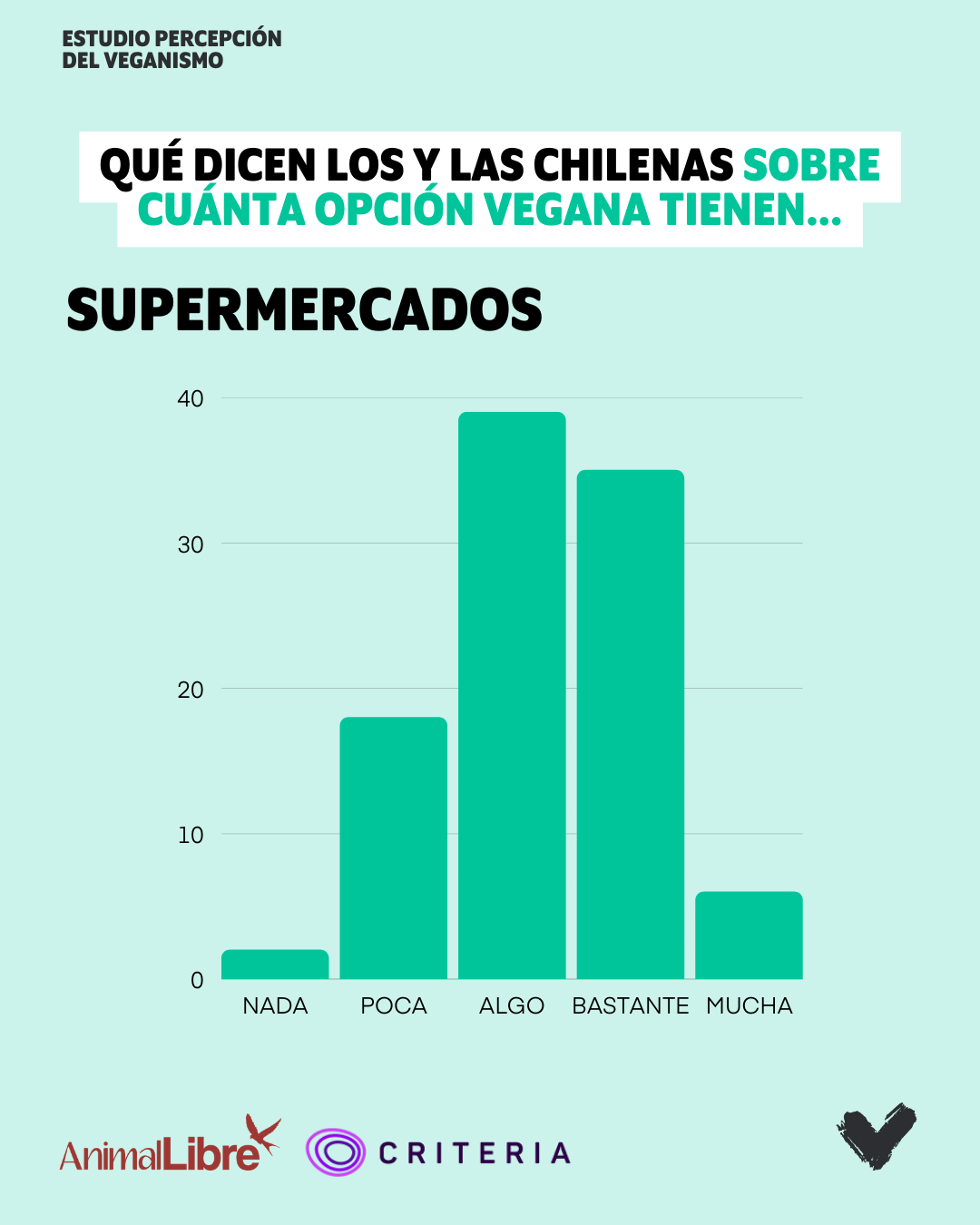 Respecto a la percepción sobre opciones veganas en cafés o fuentes de soda; casinos (universidades, colegios, hospitales y otros); restaurantes y supermercados, la investigación, realizada en septiembre de 2022, reveló que un 41% considera que hay bastante o muchas opciones veganas en supermercados, aludiendo a la mayor oferta de las diferentes marcas en el mercado, mientras que un 39% considera que hay algo de oferta vegana en este segmento.