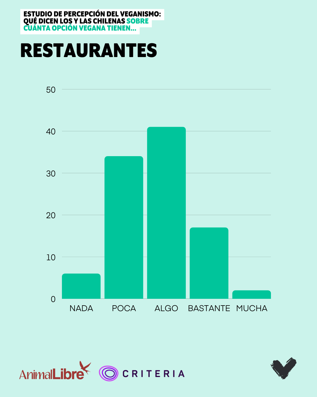 En el caso de restaurantes un 19% considera que hay bastante o muchas opciones veganas, mientras que un 41% considera que hay algo de oferta vegana. Si bien en el caso de casinos y cafés, solo un 12% manifiesta que hay bastante o muchas opciones, un 34% y un 32% respectivamente, considera que hay algo de opciones veganas.