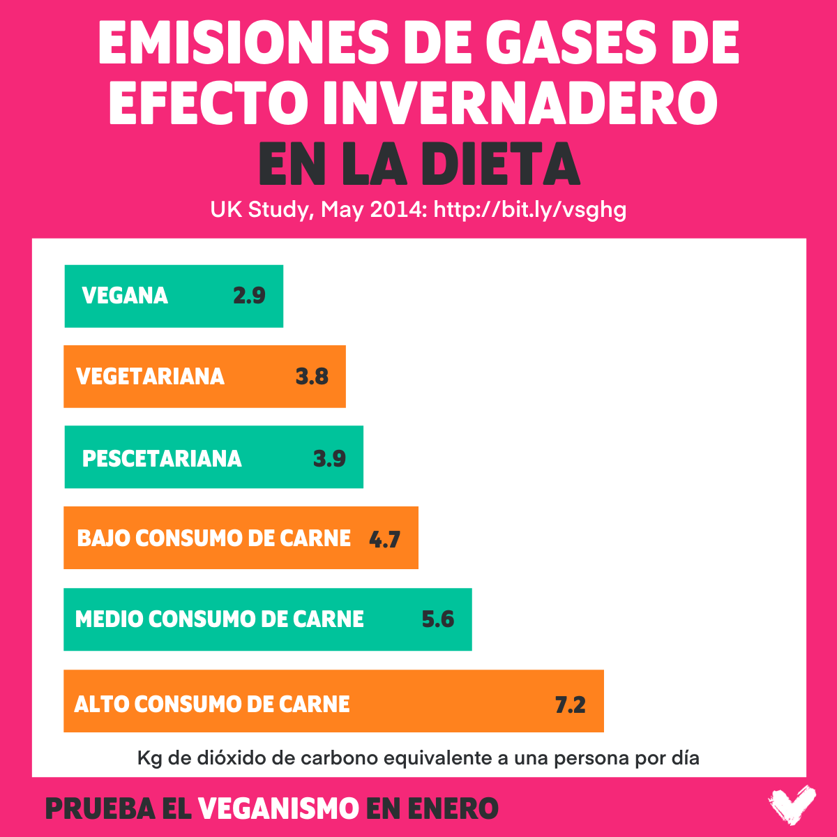Llevar una dieta vegana es más eficiente energéticamente y produce menos emisiones de gases de efecto invernadero que criar animales para el consumo humano.