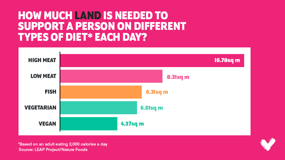 Researchers calculated how much land is needed to support different diets each day. High-meat diets were found to require significantly more land than other diets (16.78 sq ) and almost four times the amount required for vegan diets (4.37 sq m).