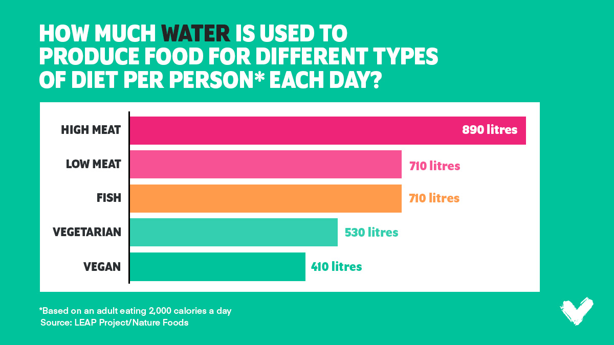High-meat diets also require more water than other diets, the research shows. A diet high in meat requires 890 litres per person each day, almost double the amount used to produce food eaten in a vegan diet.