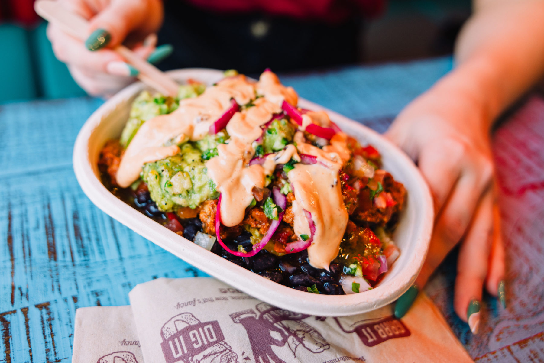 Burrito – A soft flour tortilla filled with your choice of tomato or coriander rice, pinto or black beans & the beyond steak chimichurri, vegan chilli no carne or grilled veggies. Add our hand-smashed guacamole & top it off with a range of salsas & toppings.