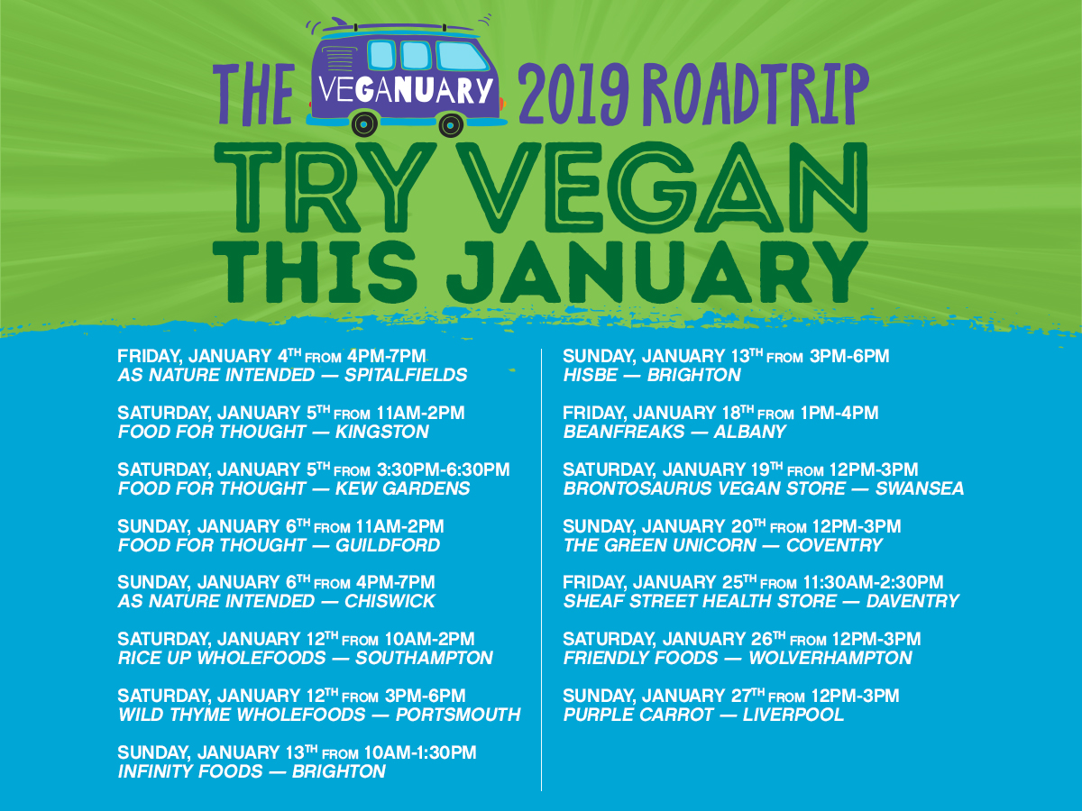 Veganuary is embarking upon a grand vegan tour this January. We’ll be visiting local, independent health food stores across the UK, and taking some of our favourite foodie brands along for the ride!